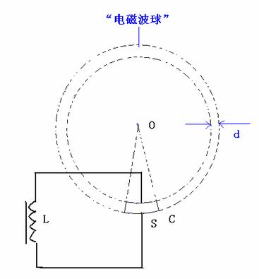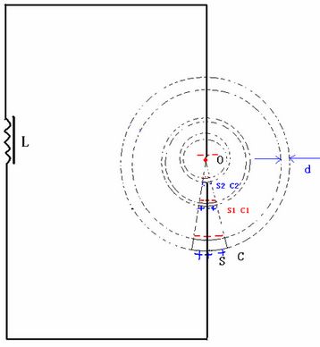 如圖7,在一個(gè)由“點(diǎn)電極”O(jiān)與“球冠電極”S組成的“球錐空間”中,如果O與S之間產(chǎn)生了足夠的“特高電壓”,那么這個(gè)“球錐空間”就可以被“雙向激擊”,依次連續(xù)發(fā)生“球冠振蕩”……、S2、……、S1、……、S,產(chǎn)生不同頻率的“電磁波球”,并且呈“嵌套球狀”分布,由外到里即由球冠S到點(diǎn)O,產(chǎn)生的“電磁波”的頻率越來越大。
